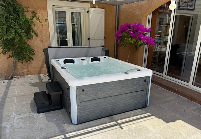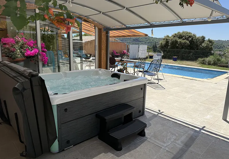 Nos clients de Vinon-sur-Verdon profitent désormais d’un spa Capri New sur leur terrasse abritée. Ce spa 3 places (2 allongées, 1 assise) de la gamme Energy offre 44 jets de massage, chromothérapie et aromathérapie. Sa cascade RGB et son éclairage extérieur apportent une touche de raffinement supplémentaire. A proximité de la piscine, il s’intègre parfaitement à leur espace de détente.