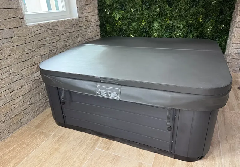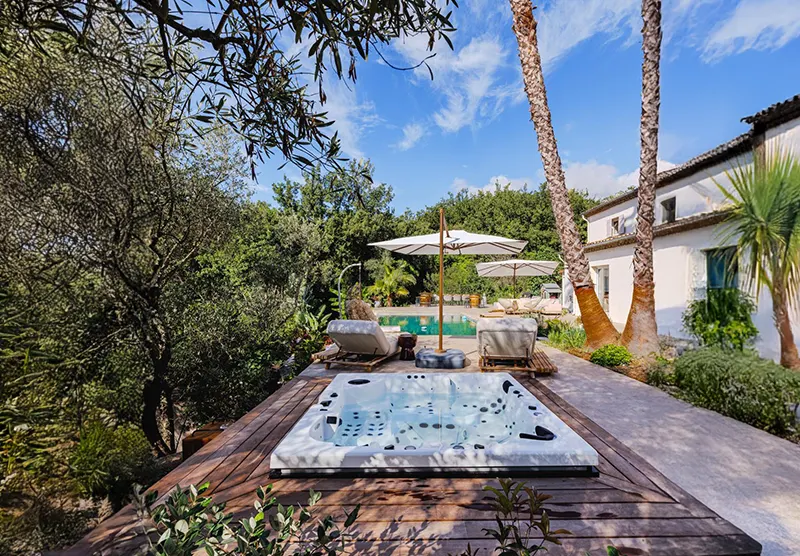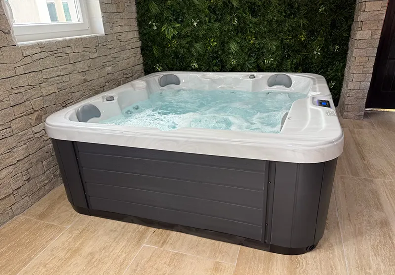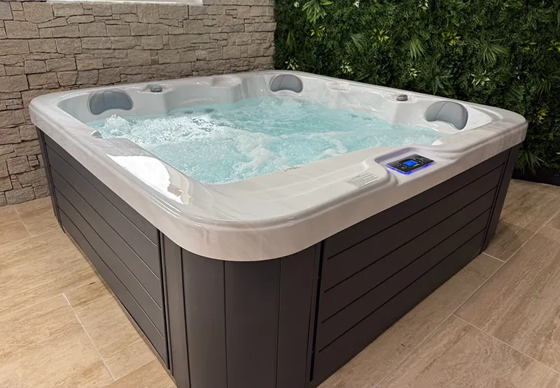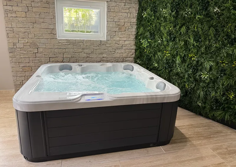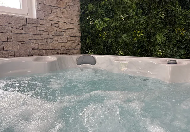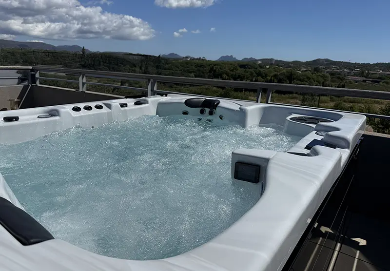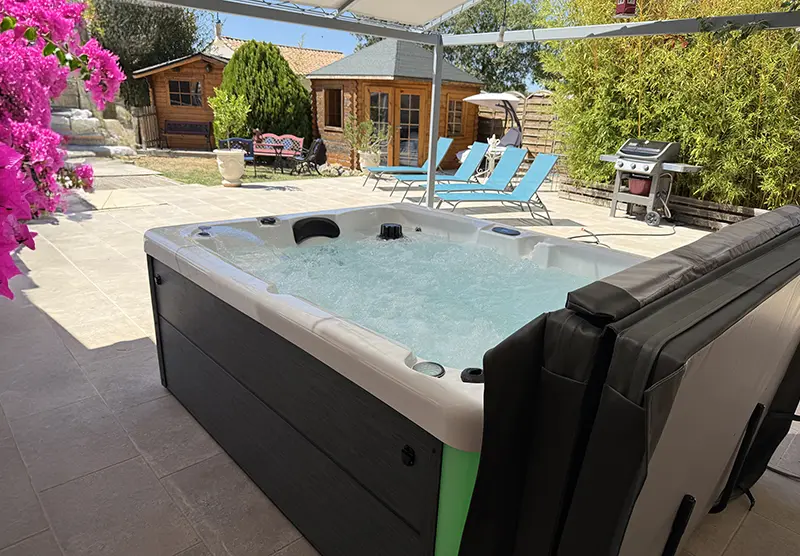 Dans un jardin ensoleillé, le spa Amalfi New de la gamme Energy s’intègre avec élégance sur une terrasse couverte, créant un espace de détente raffiné et protégé. Ce modèle 6 places (2 allongées, 4 assises) invite à la relaxation en combinant confort ergonomique et technologie de pointe. Il est équipé d’un système d’aromathérapie, de chromothérapie et d’une cascade RGB apaisante. Une installation idéale pour profiter du bien-être en toute saison.