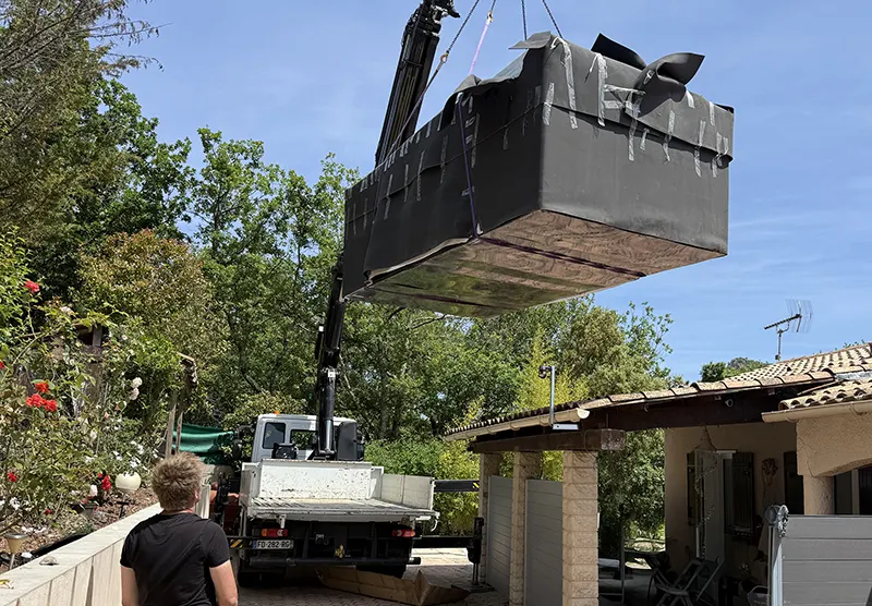 Grutage et installation d’un magnifique spa Giovanni Riboli, modèle Roma XL, de la gamme Massage. Notre client a su créer un espace fleuri et cocooning où tout est pensé pour favoriser des moments de relaxation intenses. Les fonctionnalités d’aromathérapie et de chromothérapie sont à consommer sans modération !