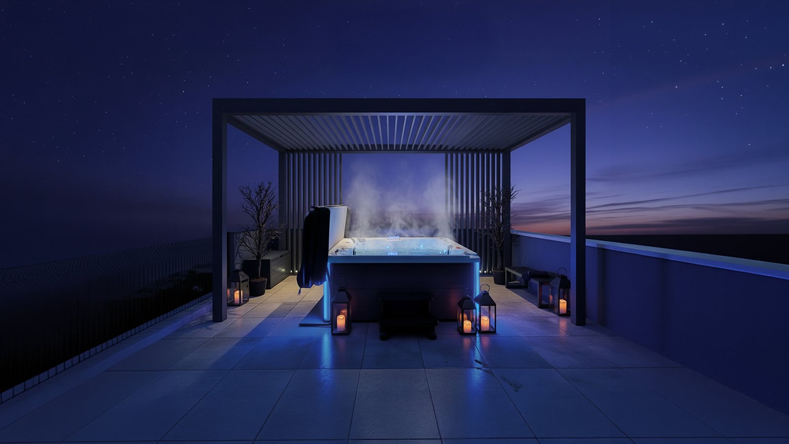 Un spa Napoli Luxe New de la gamme Thérapeutique, pensé pour offrir une expérience de massage ciblée. Avec 104 jets, il propose des programmes de massage séquentiels pour soulager les tensions et favoriser la récupération. Son design se distingue par une cuve bleu profond, associée à des panneaux en aluminium Dubaï blanc, parfaitement intégrés dans ce jardin cosy et zen.
